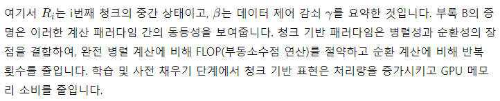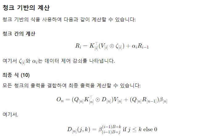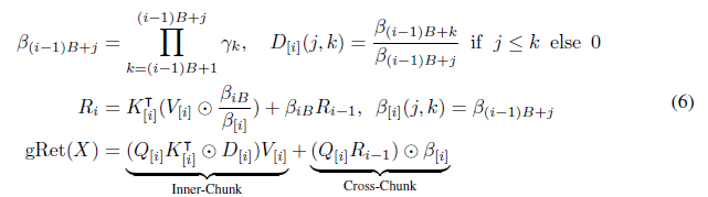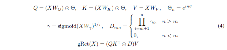 게이티드 유지(gRet, gRetNet 또는 RetNet-3라고도 함)는 데이터 의존 게이팅 메커니즘으로 유지 [SDH+23]를 강화하여 시퀀스 모델링을 위해 학습 병렬성, 좋은 성능 및 낮은 추론 비용을 동시에 달성합니다. 우리는 실험에서 기본 효율적인 자기 주의 모듈로 gRet을 사용합니다. 이 방법은 병렬, 순환 및 청크 기반 순환 계산 패러다임을 통합합니다. 이 세 가지 표현은 동등하며 동일한 계산 결과를 얻을 수 있습니다. 학습 과정에서는 보통 병렬 또는 청크 기반 순환 패러다임을 사용하며, 추론 단계에서는 일정한 KV 메모리를 위해 순환 패러다임을 사용할 수 있습니다. 세 가지 표현을 다음과 같이 설명합니다:
