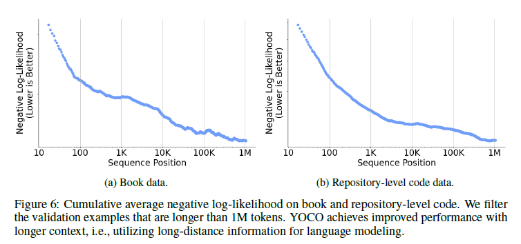 그림 6은 책과 저장소 수준의 코드에서의 누적 평균 음의 로그 가능성을 보여줍니다. 우리는 1M 토큰보다 긴 검증 예제를 필터링합니다. YOCO는 더 긴 문맥으로 더 나은 성능을 달성하며, 즉 언어 모델링을 위해 장거리 정보를 활용합니다.