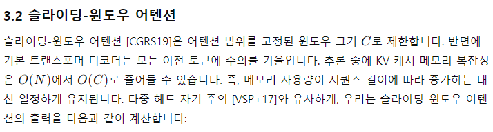 그러나 제공하는 토큰의 수가 증가함에 따라 KV 캐시는 많은 GPU 메모리를 차지하여 대형 언어 모델의 추론을 메모리 한계로 만듭니다 [PDC+22]. 예를 들어, 65B 크기의 언어 모델(그룹 쿼리 어텐션 [ALTdJ+23]과 8비트 KV 양자화를 사용한 모델)의 경우 512K 토큰이 약 86GB의 GPU 메모리를 차지하여 H100-80GB GPU 하나의 용량보다 큽니다. 또한, 긴 시퀀스 입력의 사전 채우기 지연 시간은 매우 높습니다. 예를 들어, 4개의 H100 GPU를 사용하여 Flash-Decoding [DHMS23]과 커널 융합이 추가된 7B 언어 모델의 경우 450K 토큰을 사전 채우는 데 약 110초, 1M 길이의 경우 380초가 소요됩니다. 이러한 병목 현상은 긴 문맥 언어 모델을 실용적으로 배포하는 것을 어렵게 만듭니다.