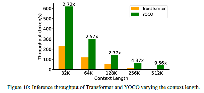 그림 10: 문맥 길이에 따른 트랜스포머와 YOCO의 추론 처리량.