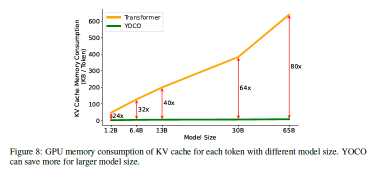 그림 8: 다양한 모델 크기에 따른 각 토큰의 KV 캐시 GPU 메모리 소비. YOCO는 더 큰 모델 크기에서도 더 많은 메모리를 절약합니다.