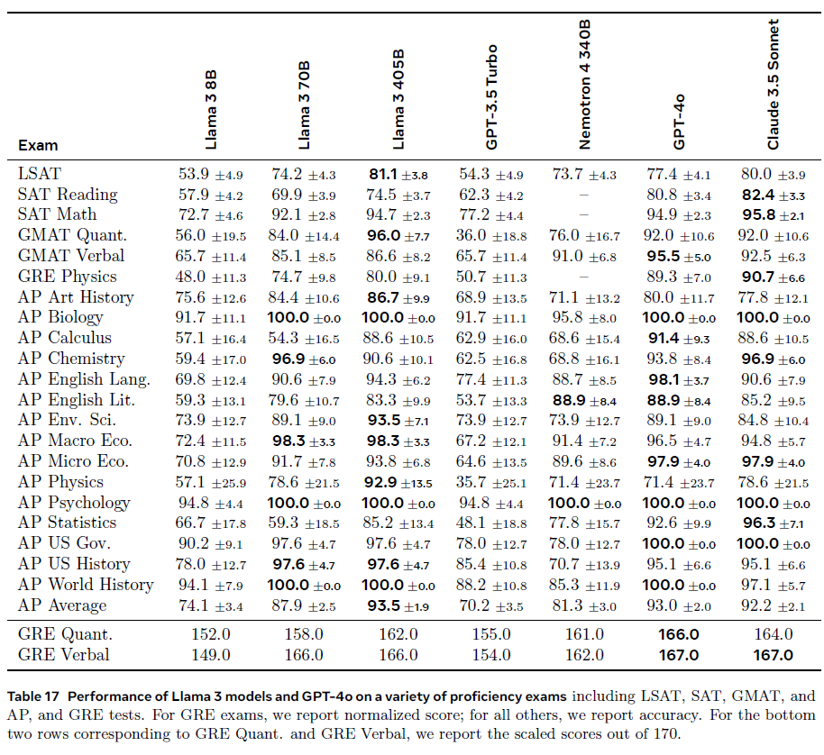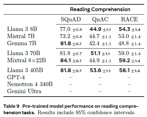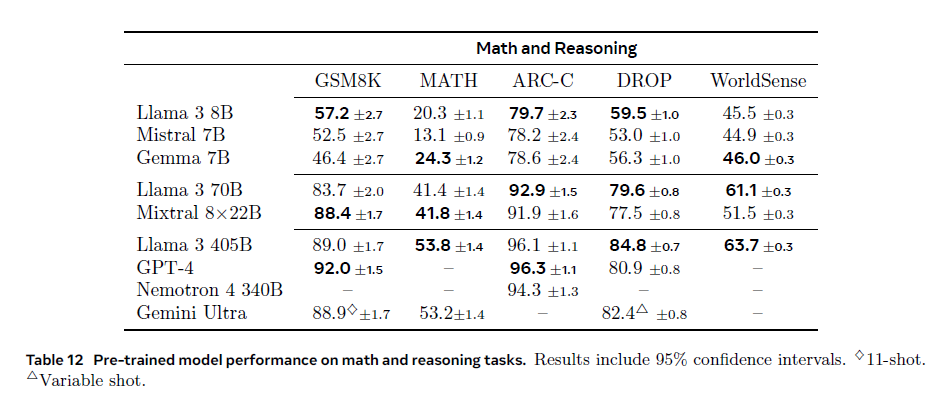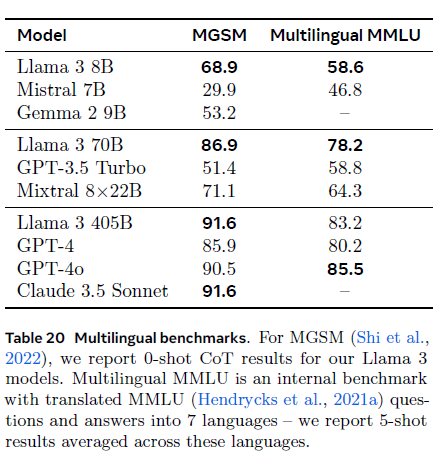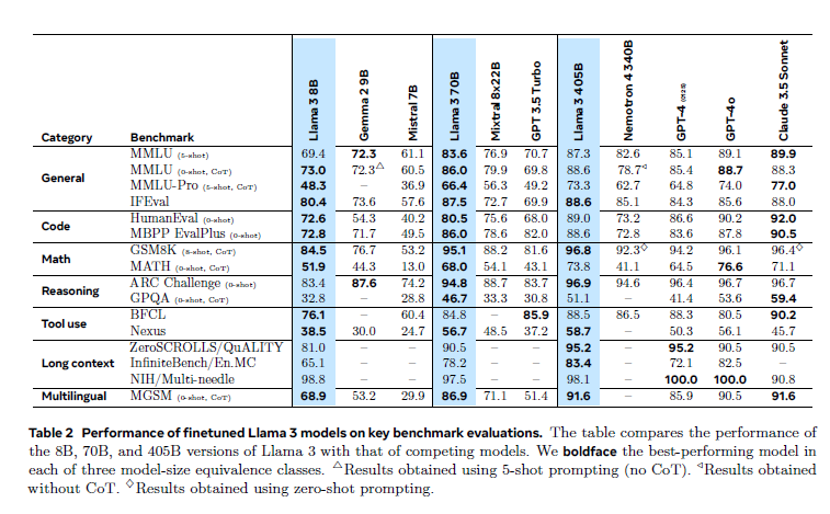 Table 2: 주요 벤치마크 평가에서 세부 조정된 Llama 3 모델의 성능. 표는 8B, 70B 및 405B 버전의 Llama 3 성능을 경쟁 모델과 비교합니다. 세 가지 모델 크기 동등성 클래스에서 최고 성능을 나타내는 모델을 볼드체로 표시했습니다. 결과는 5-shot 프롬프팅(일부는 CoT 제외), zero-shot 프롬프팅을 사용한 결과를 포함합니다.
