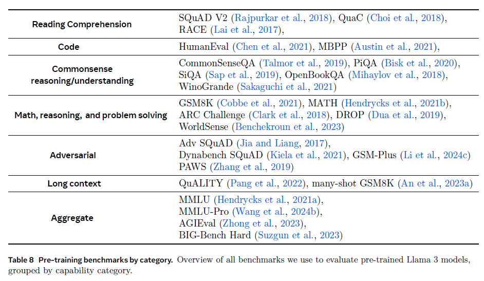 경험적으로, 소량의 고품질 코드 및 수학 데이터를 어닐링(annealing, 섹션 3.4.3 참조)하면 주요 벤치마크에서 사전 훈련된 모델의 성능을 향상시킬 수 있다는 것을 발견했습니다. Li et al. (2024b)와 유사하게, 우리는 선택된 도메인의 고품질 데이터를 업샘플링한 데이터 믹스로 어닐링을 수행합니다. 우리의 어닐링 데이터에는 일반적으로 사용되는 벤치마크의 훈련 세트를 포함하지 않습니다. 이는 Llama 3의 진정한 몇 샷 학습 능력과 도메인 외 일반화를 평가할 수 있게 합니다.