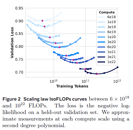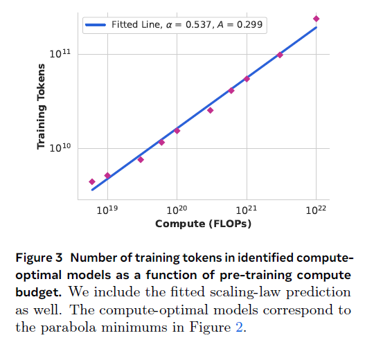 이 접근법을 통해 특정 훈련 FLOPs 수에 대해 컴퓨팅 최적 모델의 다운스트림 작업 성능을 예측할 수 있습니다. 우리는 유사한 방법을 사용하여 사전 훈련 데이터 믹스를 선택합니다(섹션 3.4 참조).