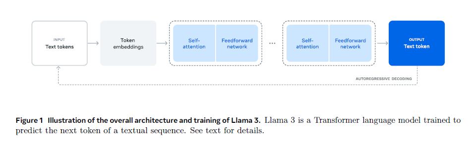 그림 1: Llama 3의 전체 아키텍처 및 훈련에 대한 설명. Llama 3는 텍스트 시퀀스의 다음 토큰을 예측하도록 훈련된 Transformer 언어 모델입니다. 자세한 내용은 본문을 참조하세요.