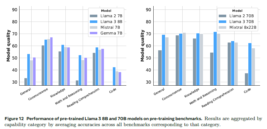 - 데이터: 이전 버전의 Llama (Touvron et al., 2023a,b)와 비교하여, 우리는 사전 훈련 및 사후 훈련에 사용하는 데이터의 양과 질을 개선했습니다. 이러한 개선에는 사전 훈련 데이터에 대한 더 신중한 전처리 및 큐레이션 파이프라인 개발과 사후 훈련 데이터에 대한 더 엄격한 품질 보증 및 필터링 접근법 개발이 포함됩니다. 우리는 Llama 3를 약 15조 개의 다중 언어 토큰 코퍼스를 사용하여 사전 훈련했으며, 이는 Llama 2의 1.8조 토큰과 비교됩니다.
