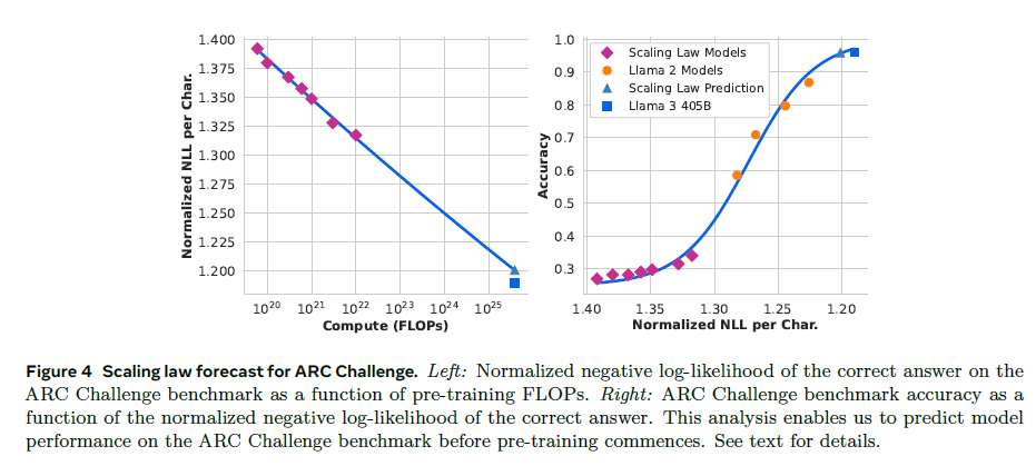 - 다음으로, 스케일링 법칙 모델과 더 높은 컴퓨팅 FLOPs로 훈련된 이전 모델을 활용하여 다운스트림 작업에 대한 음의 로그 우도와 작업 정확도 간의 상관관계를 설정합니다. 이 단계에서 우리는 특히 Llama 2 모델 군을 활용합니다.