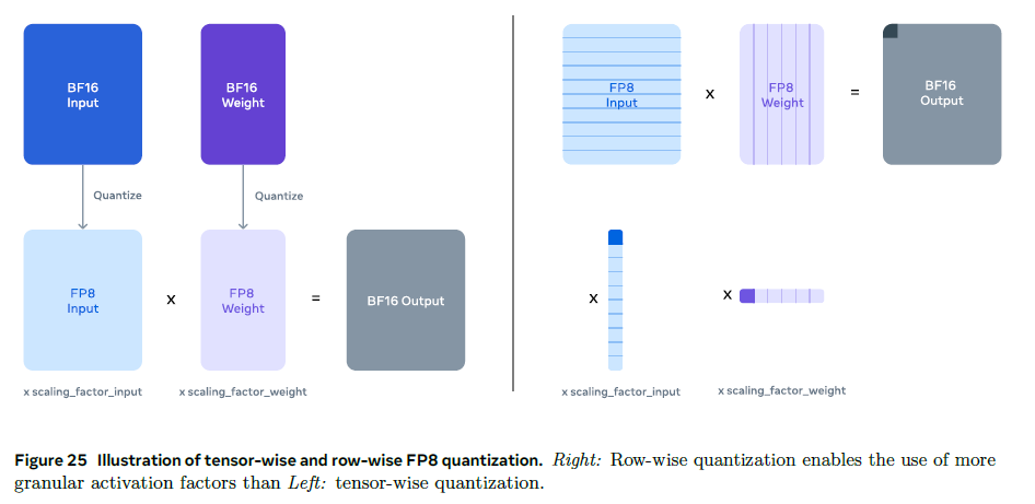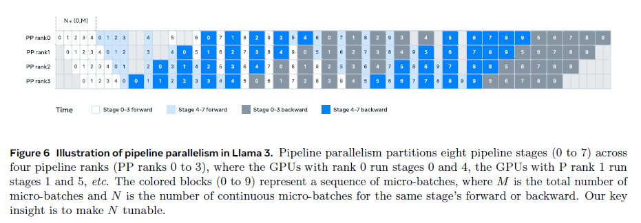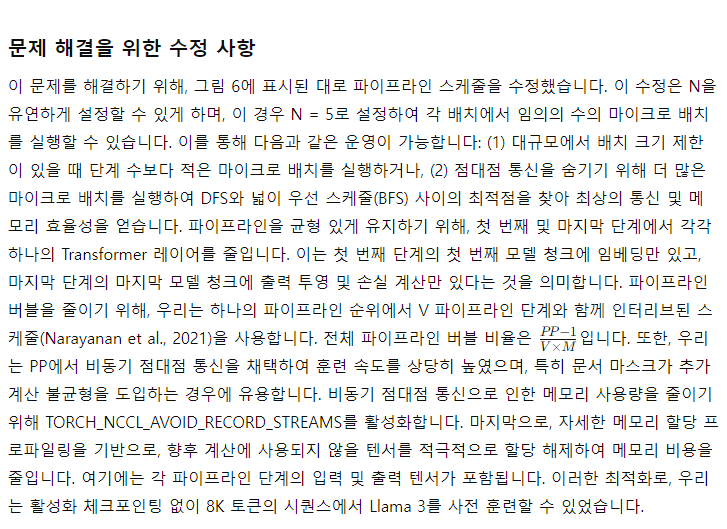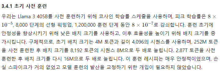 - 언어 모델 사전 훈련: 우리는 대규모 다중 언어 텍스트 코퍼스를 이산 토큰으로 변환한 후, 생성된 데이터를 사용하여 대규모 언어 모델(LLM)을 사전 훈련하여 다음 토큰을 예측하도록 합니다. 언어 모델 사전 훈련 단계에서 모델은 언어 구조를 배우고, 읽는 텍스트에서 세상에 대한 많은 지식을 얻습니다. 이를 효과적으로 수행하기 위해 사전 훈련은 대규모로 수행됩니다. 우리는 4050억 개의 매개변수를 가진 모델을 15.6조 개의 토큰과 8K 토큰의 컨텍스트 창을 사용하여 사전 훈련합니다. 이 표준 사전 훈련 단계 후, 지원되는 컨텍스트 창을 128K 토큰으로 확장하는 지속 사전 훈련 단계가 이어집니다. 자세한 내용은 섹션 3을 참조하세요.