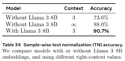 테이블 34는 샘플별 텍스트 정규화(TN) 정확도를 보여줍니다. 우리는 Llama 3 8B 임베딩을 사용한 모델과 사용하지 않은 모델을, 그리고 다른 오른쪽 컨텍스트 값을 사용한 모델을 비교했습니다.