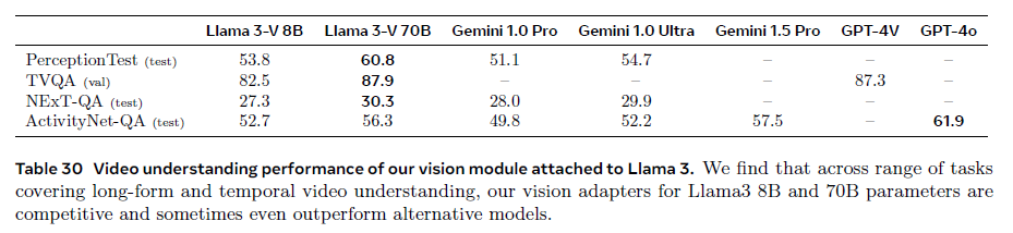 테이블 30은 우리의 실험 결과를 보여줍니다. 테이블의 결과는 Llama 3의 비전 모듈이 긴 형식 및 시간적 비디오 이해를 포함하는 다양한 작업에서 경쟁력 있으며, 때로는 다른 모델보다 더 우수한 성능을 발휘함을 보여줍니다.