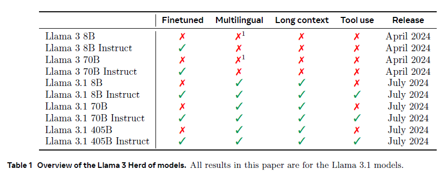 Table 1: Llama 3 모델 군집 개요. 이 논문의 모든 결과는 Llama 3.1 모델에 대한 것입니다.