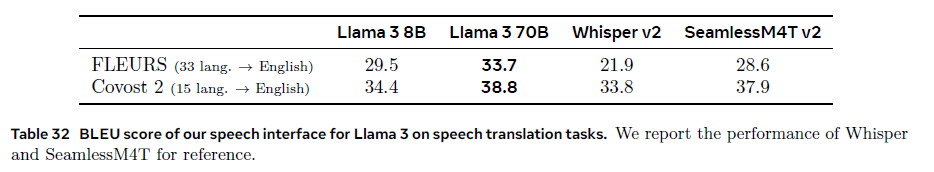 테이블 32는 음성 번역 작업에 대한 Llama 3의 음성 인터페이스의 BLEU 점수를 보여줍니다. 우리는 참조를 위해 Whisper와 SeamlessM4T의 성능을 보고합니다.