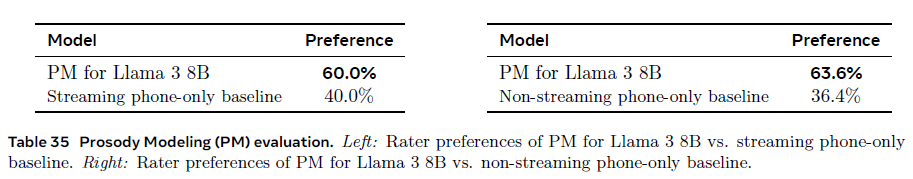먼저, Llama 3 임베딩이 없는 스트리밍 기준 모델과 직접 비교를 수행했습니다. 두 번째 테스트에서는 Llama 3 8B PM을 Llama 3 임베딩이 없는 비스트리밍 기준 모델과 비교했습니다. 테이블 35에 표시된 바와 같이, Llama 3 8B PM은 스트리밍 기준 모델과 비교했을 때 60%의 선호도를 얻었고, 비스트리밍 기준 모델과 비교했을 때 63.6%의 선호도를 얻어 인식된 품질이 크게 향상되었음을 나타냅니다. Llama 3 8B PM의 주요 장점은 토큰 단위 스트리밍 기능(Section 8.2.2)으로, 추론 시 낮은 대기 시간을 유지합니다. 이는 모델의 선행 요구 사항을 줄여 비스트리밍 기준 모델에 비해 더 응답적이고 실시간 음성 합성을 가능하게 합니다. 전반적으로, Llama 3 8B 운율 모델은 기준 모델을 일관되게 능가하여 합성된 음성의 자연스러움과 표현력을 향상시키는 데 효과적임을 입증했습니다.