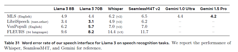 테이블 31은 음성 인식 작업에 대한 Llama 3의 음성 인터페이스의 단어 오류율을 보여줍니다. 우리는 참조를 위해 Whisper, SeamlessM4T 및 Gemini의 성능을 보고합니다.