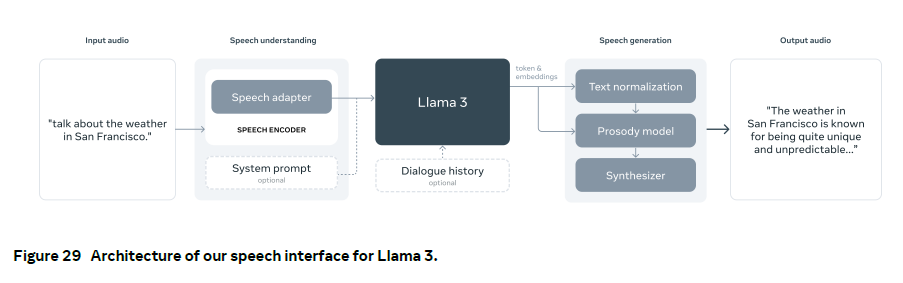 그림 29는 Llama 3의 음성 인터페이스 아키텍처를 보여줍니다.
