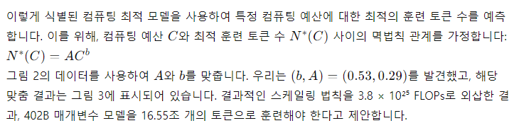 Llama 3 405B는 126개의 레이어, 16,384 토큰 표현 차원 및 128 어텐션 헤드를 가진 아키텍처를 사용합니다. 자세한 내용은 표 3을 참조하세요. 이는 우리의 훈련 예산인 3.8 × 10²⁵ FLOPs에 대한 데이터 스케일링 법칙에 따라 대략적으로 컴퓨팅 최적 모델 크기를 이끌어냅니다.