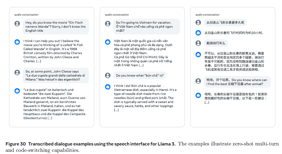 그림 30은 Llama 3의 음성 인터페이스를 사용한 전사된 대화 예시를 보여줍니다. 이 예시들은 제로샷 다중 턴 및 코드 스위칭 기능을 설명합니다.