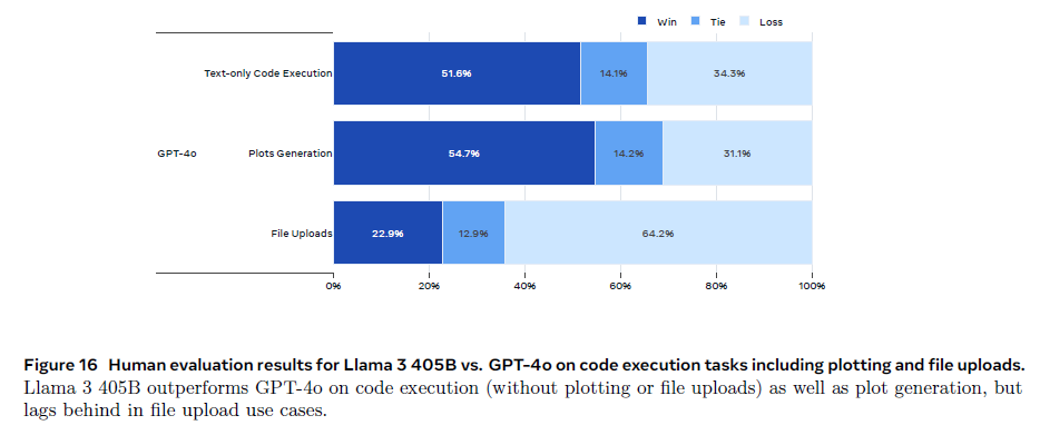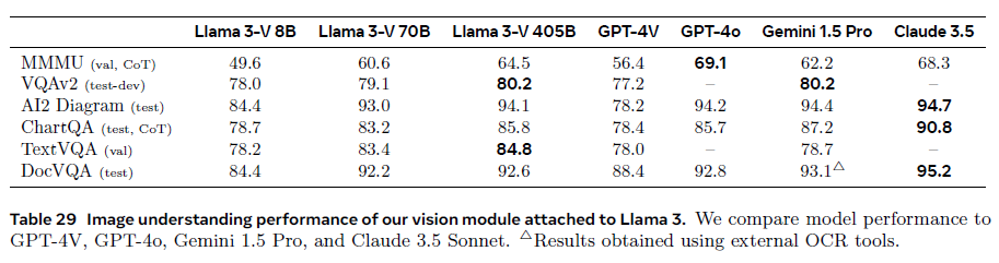 테이블 29에는 우리의 실험 결과가 나와 있습니다. 테이블의 결과는 Llama 3에 연결된 비전 모듈이 다양한 이미지 인식 벤치마크에서 경쟁력 있는 성능을 보임을 보여줍니다. Llama 3-V 405B 모델을 사용하여 우리는 모든 벤치마크에서 GPT-4V를 능가했으며, Gemini 1.5 Pro와 Claude 3.5 Sonnet에 비해 약간 뒤처졌습니다. Llama 3 405B는 특히 문서 이해 작업에서 경쟁력이 있는 것으로 나타났습니다.