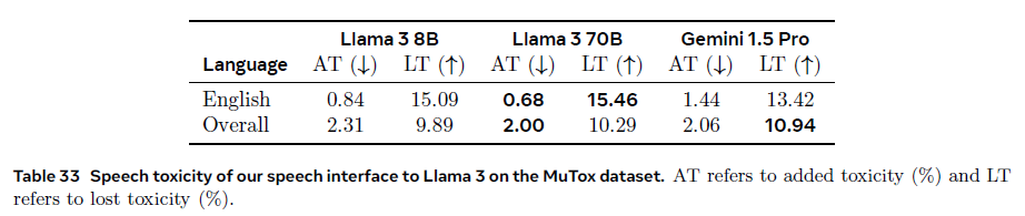 테이블 33은 MuTox 데이터셋에서 Llama 3의 음성 인터페이스의 독성을 평가한 것입니다. AT는 추가된 독성(%)을, LT는 잃은 독성(%)을 나타냅니다.