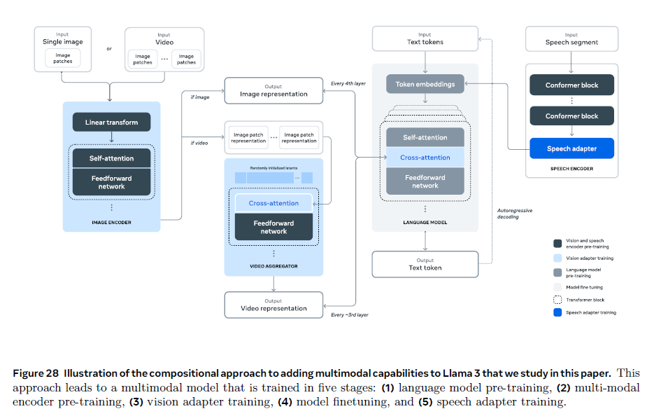 이러한 과정으로 생성된 모델은 풍부한 기능 세트를 갖추게 됩니다. 이 모델들은 최소 8개 언어로 질문에 답하고, 고품질의 코드를 작성하며, 복잡한 추론 문제를 해결하고, 도구를 바로 사용하거나 제로샷 방식으로 사용할 수 있습니다. 또한, 우리는 Llama 3에 이미지, 비디오 및 음성 기능을 추가하는 실험을 수행하였으며, 이는 조합적 접근법을 사용합니다. 우리가 연구한 접근법은 그림 28에 설명된 세 가지 추가 단계를 포함합니다: