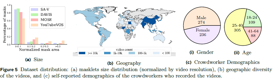 우리는 크라우드 워커들이 촬영한 50.9K개의 새로운 비디오 세트를 수집했습니다. 비디오는 54% 실내 장면과 46% 실외 장면으로 구성되어 있으며, 평균 지속 시간은 14초입니다. 비디오는 다양한 일상적인 시나리오를 다루며, "야생에서" 다양한 환경을 특징으로 합니다. 우리의 데이터셋은 기존의 VOS 데이터셋보다 더 많은 비디오를 포함하고 있으며, 그림 5에 표시된 바와 같이, 비디오는 47개국에 걸쳐 있으며 다양한 참가자들에 의해 촬영되었습니다(자체 보고된 인구 통계).