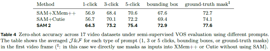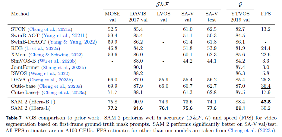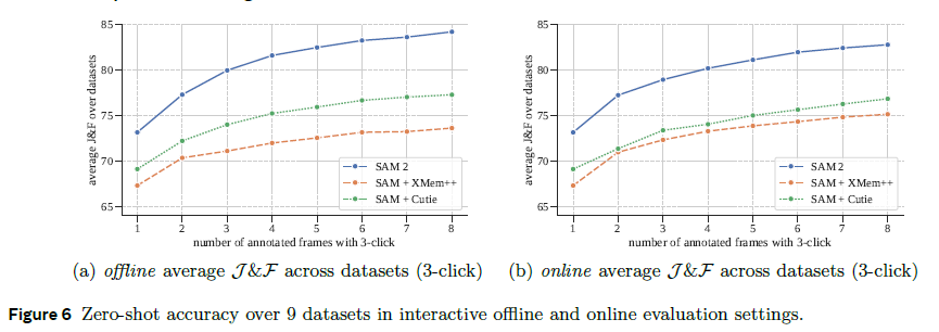 우리의 실험 (§6)은 SAM 2가 비디오 분할 경험에 큰 변화를 가져온다는 것을 보여줍니다. SAM 2는 이전 접근 방식보다 3배 적은 상호작용을 사용하면서 더 나은 분할 정확도를 제공할 수 있습니다. 또한, SAM 2는 다양한 평가 설정에서 기존의 비디오 객체 분할 벤치마크에서 이전 작업을 능가하며, 이미지 분할 벤치마크에서도 SAM보다 더 나은 성능을 제공하며 6배 더 빠릅니다. SAM 2는 비디오와 이미지 분포 전반에 걸쳐 다양한 제로 샷 벤치마크(비디오 분할 17개, 단일 이미지 분할 37개)에서 효과적임을 보여줍니다.