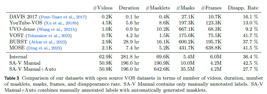 표 3: SA-V 데이터셋과 오픈 소스 VOS 데이터셋 비교