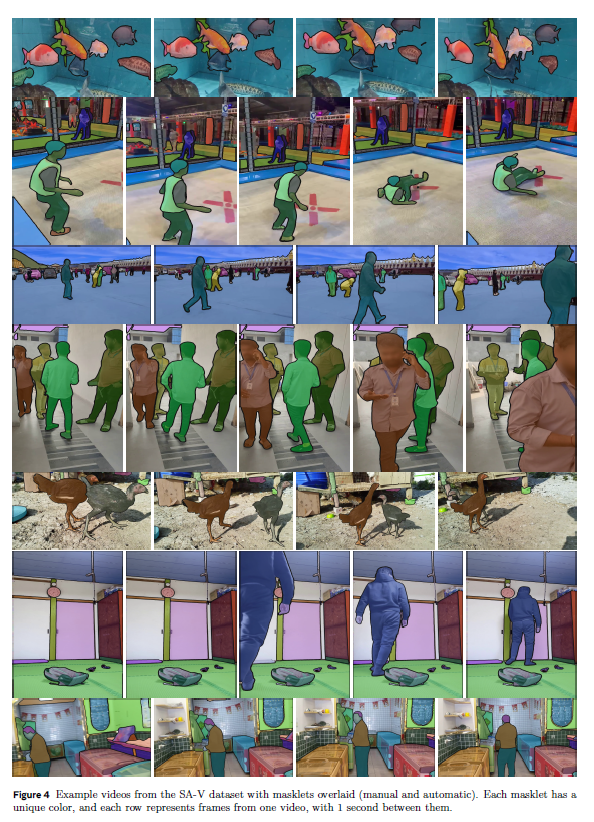 SA-V 데이터셋의 예제 비디오로, 수동 및 자동으로 생성된 마스크렛이 겹쳐져 있습니다. 각 마스크렛은 고유한 색상을 가지며, 각 행은 하나의 비디오에서 1초 간격으로 캡처된 프레임을 나타냅니다.