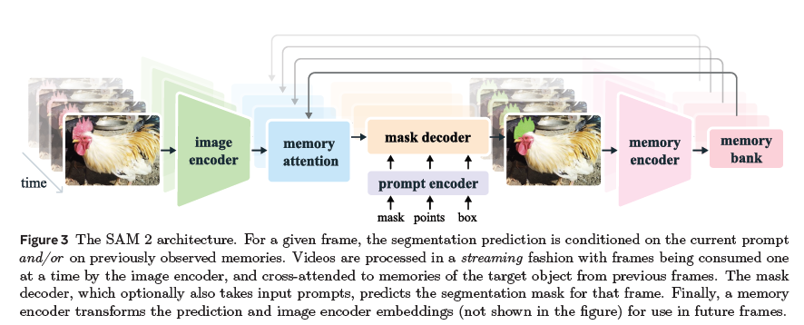 SAM 2 아키텍처. 주어진 프레임에 대해, 분할 예측은 현재 프롬프트와/또는 이전에 관찰된 메모리에 조건화됩니다. 비디오는 이미지 인코더에 의해 한 번에 하나의 프레임씩 소비되는 스트리밍 방식으로 처리되며, 이전 프레임에서의 대상 객체의 메모리에 교차 주의를 기울입니다. 마스크 디코더는 선택적으로 입력 프롬프트도 받아 해당 프레임의 분할 마스크를 예측합니다. 마지막으로, 메모리 인코더는 예측과 이미지 인코더 임베딩(그림에는 표시되지 않음)을 변환하여 향후 프레임에서 사용합니다.