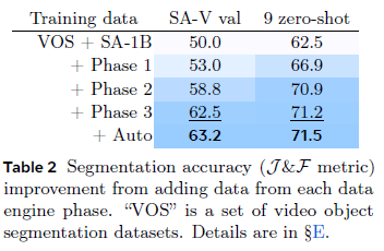 표 2 각 데이터 엔진 단계에서 데이터를 추가하여 분할 정확도(J&F 메트릭)가 개선된 결과를 보여줍니다. "VOS"는 비디오 객체 분할 데이터셋을 의미합니다. 자세한 내용은 §E에 있습니다.