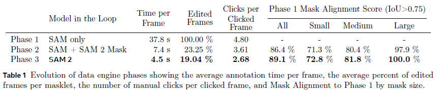 표 1 데이터 엔진 단계의 진화를 보여주며, 프레임당 평균 주석 시간, 마스크렛당 편집된 프레임의 평균 비율, 클릭된 프레임당 수동 클릭 수 및 마스크 크기별 1단계와의 마스크 정렬을 나타냅니다.
