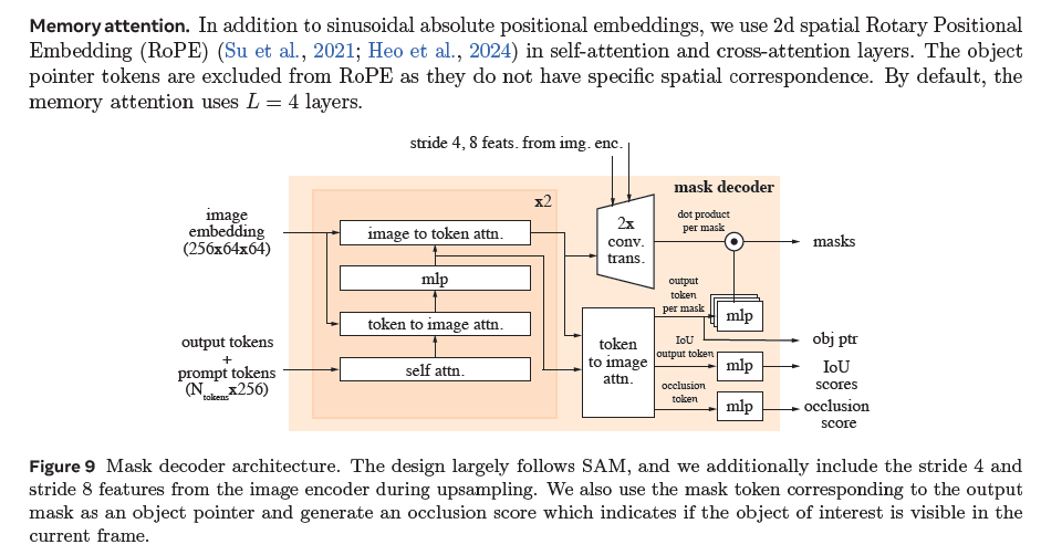 디자인은 주로 SAM을 따르며, 업샘플링하는 동안 이미지 인코더의 stride 4와 stride 8 피처를 추가로 포함합니다. 우리는 또한 출력 마스크에 해당하는 마스크 토큰을 객체 포인터로 사용하고, 관심 객체가 현재 프레임에서 보이는지를 나타내는 폐색 점수(occlusion score)를 생성합니다.