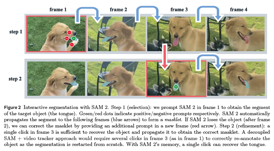프레임 1에서 SAM 2에 프롬프트를 주어 목표 객체(혀)의 세그먼트를 얻습니다. 초록색/빨간색 점은 각각 긍정/부정 프롬프트를 나타냅니다. SAM 2는 자동으로 세그먼트를 다음 프레임으로 전파하여 마스크렛을 형성합니다(파란색 화살표). SAM 2가 객체를 잃어버리면(프레임 2 이후), 새로운 프레임에 추가 프롬프트를 제공하여 마스크렛을 수정할 수 있습니다(빨간색 화살표).
