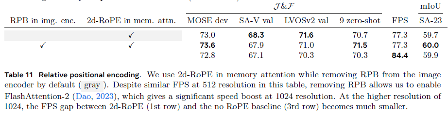 - 객체 포인터: 객체 포인터에 교차 어텐션하는 것이 SA-V 검증 데이터셋 및 LVOSv2 벤치마크에서 성능을 크게 향상시킵니다.