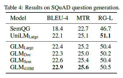 표 4: SQuAD 질문 생성의 결과.