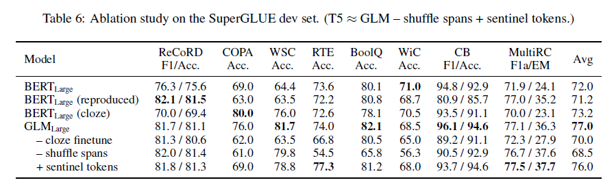 표 6: SuperGLUE 개발 세트에서의 소거 연구. (T5 GLM – 스팬 셔플링 + 센티넬 토큰.)