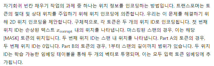 우리의 인코딩 방법은 모델이 스팬을 재구성할 때 마스킹된 스팬의 길이를 인지하지 못하게 보장합니다. 이는 다른 모델과 비교했을 때 중요한 차이점입니다. 예를 들어, XLNet(Yang et al., 2019)은 원래 위치를 인코딩하여 누락된 토큰의 수를 인지할 수 있으며, SpanBERT(Joshi et al., 2020)는 스팬을 여러 개의 [MASK] 토큰으로 대체하고 길이를 유지합니다. 우리의 설계는 생성된 텍스트의 길이를 미리 알 수 없는 경우가 많은 다운스트림 작업에 적합합니다.