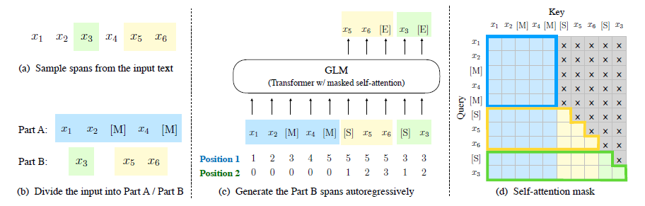 그림 2: GLM 사전 학습. (a) 원래 텍스트는 [x1; x2; x3; x4; x5; x6]입니다. 두 개의 스팬 [x3]과 [x5; x6]이 샘플링됩니다. (b) 샘플링된 스팬을 Part A에서 [M]으로 대체하고, Part B에서 스팬을 셔플합니다. (c) GLM은 자기회귀 방식으로 Part B를 생성합니다. 각 스팬은 입력으로 [S], 출력으로 [E]로 시작됩니다. 2D 위치 인코딩은 스팬 간 및 스팬 내 위치를 나타냅니다. (d) 셀프 어텐션 마스크. 회색 영역은 마스킹됩니다. Part A의 토큰은 자신에게만 주의를 기울일 수 있지만(파란색 프레임), Part B에는 주의를 기울일 수 없습니다. Part B의 토큰은 Part A와 Part B 내의 선행 토큰에 주의를 기울일 수 있습니다(노란색 및 녹색 프레임은 두 스팬에 해당합니다). [M] = [MASK], [S] = [START], [E] = [END].