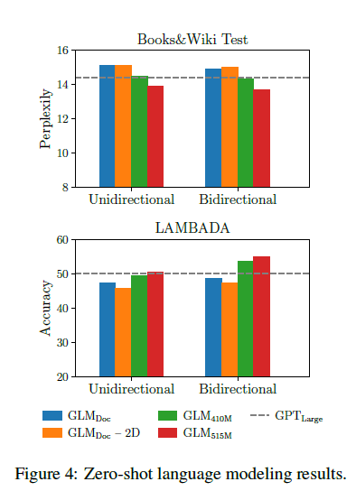 대부분의 언어 모델링 데이터셋(예: WikiText103)은 이미 우리의 사전 학습 데이터셋에 포함된 Wikipedia 문서로 구성되어 있습니다. 따라서 우리는 사전 학습 데이터셋의 보류된 테스트 세트(약 2000만 토큰 포함)인 BookWiki에서 언어 모델링 perplexity를 평가합니다. 또한 우리는 LAMBADA 데이터셋(Paperno et al., 2016)에서 GLM을 평가합니다. LAMBADA는 시스템이 텍스트에서 장거리 의존성을 모델링하는 능력을 테스트하는 데이터셋으로, 주어진 단락의 마지막 단어를 예측하는 과제입니다. 기준 모델로서 우리는 GLMLarge와 동일한 데이터와 토크나이징을 사용하여 GPTLarge 모델(Radford et al., 2018b; Brown et al., 2020)을 학습합니다.