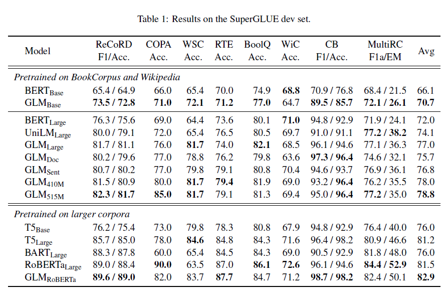 표 1: SuperGLUE 개발 세트의 결과.