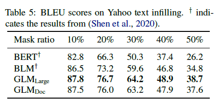 텍스트 인필링은 주변 문맥과 일치하는 누락된 텍스트 스팬을 예측하는 작업입니다(Zhu et al., 2019; Donahue et al., 2020; Shen et al., 2020). GLM은 자기회귀 빈칸 채우기 목표로 학습되었으므로 이 작업을 간단히 해결할 수 있습니다. 우리는 Yahoo Answers 데이터셋(Yang et al., 2017)에서 GLM을 평가하고, 텍스트 인필링을 위해 특별히 설계된 모델인 Blank Language Model(BLM)(Shen et al., 2020)과 비교합니다. 표 5의 결과에서 볼 수 있듯이, GLM은 이전 방법들을 큰 차이(1.3에서 3.9 BLEU)로 능가하며 이 데이터셋에서 최첨단 결과를 달성합니다. 우리는 GLMDoc이 GLMLarge보다 약간 낮은 성능을 보인다는 것을 주목했는데, 이는 seq2seq 실험에서 관찰한 바와 일치합니다.