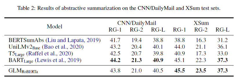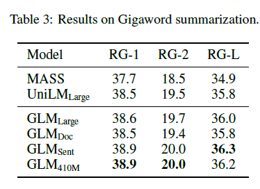 BookCorpus와 Wikipedia에서 학습된 모델의 결과는 표 3과 4에 나와 있습니다. 우리는 GLMLarge가 두 가지 생성 작업에서 다른 사전 학습 모델과 성능을 맞출 수 있음을 관찰했습니다. GLMSent는 GLMLarge보다 더 나은 성능을 발휘할 수 있는 반면, GLMDoc는 GLMLarge보다 약간 낮은 성능을 보입니다. 이는 주어진 문맥을 확장하는 것을 가르치는 문서 수준 목표가 문맥에서 유용한 정보를 추출하는 것을 목표로 하는 조건부 생성에 덜 도움이 된다는 것을 나타냅니다. GLMDoc의 매개변수를 410M으로 늘리면 두 작업에서 최고의 성능을 발휘합니다. 더 큰 코퍼스에서 학습된 모델의 결과는 표 2에 나와 있습니다. GLMRoBERTa는 seq2seq BART 모델과 성능을 맞출 수 있으며, T5와 UniLMv2를 능가합니다.