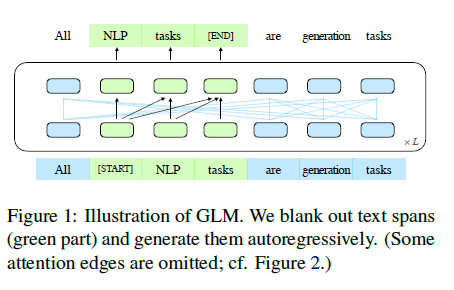 그림 1: GLM의 설명 그림. 우리는 텍스트 스팬(녹색 부분)을 빈칸으로 만들고 이를 자기회귀적으로 생성합니다. (일부 주의 엣지는 생략되었습니다; 그림 2를 참조하십시오.)