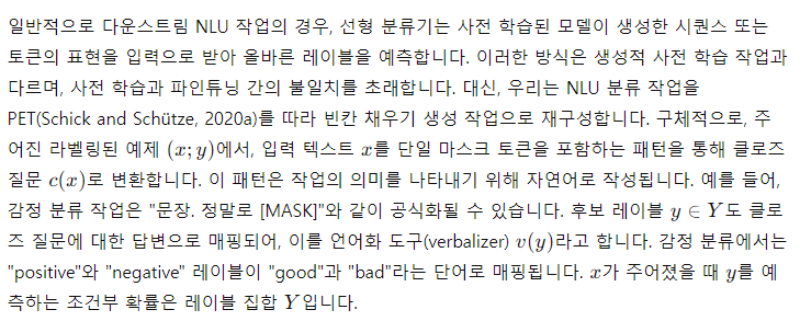 이전에 사전 학습된 언어 모델은 학습된 표현에서 선형 분류기를 사용하여 NLU 분류 작업을 완료했습니다. GPT-2(Radford et al., 2018b)와 GPT-3(Brown et al., 2020)는 생성 언어 모델이 과제 지시 또는 몇 가지 라벨링된 예제를 제공받았을 때 파인튜닝 없이도 질문 응답과 같은 NLU 작업을 직접 예측할 수 있음을 보여주었습니다. 그러나 생성 모델은 단방향 주의의 한계로 인해 더 많은 매개변수가 필요합니다. 최근 PET(Schick and Schütze, 2020a,b)는 입력 예제를 소수 샷 설정에서 사전 학습 코퍼스와 유사한 패턴의 클로즈 질문으로 재구성할 것을 제안했습니다. 이는 경사 기반 파인튜닝과 결합하면 PET이 GPT-3보다 0.1%의 매개변수로 더 나은 성능을 달성할 수 있음을 보여주었습니다. 유사하게 Athiwaratkun et al. (2020)과 Paolini et al. (2020)은 시퀀스 태그 및 관계 추출과 같은 구조화된 예측 작업을 시퀀스 생성 작업으로 변환합니다.