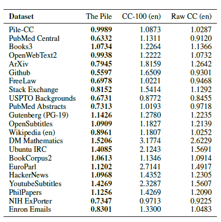 GPT-2 BPE 토크나이저는 WebText에서 훈련되었기 때문에, 토큰당 평균 바이트 수는 각 Pile 구성 요소가 WebText와 얼마나 구문적으로 다른지에 대한 대략적인 지표입니다. 예를 들어, NIH ExPorter, OpenWebText2, Books3와 같은 데이터셋은 주로 일반 텍스트로 구성되어 있으며, 이는 더 많은 토큰당 바이트 수에 반영됩니다. 반면, 토큰당 바이트 수가 가장 적은 많은 데이터셋은 비문자 텍스트로 구성된 데이터셋(Github, ArXiv, Stack Exchange, DM Mathematics)이나 영어 외의 언어로 된 데이터셋(EuroParl)입니다.