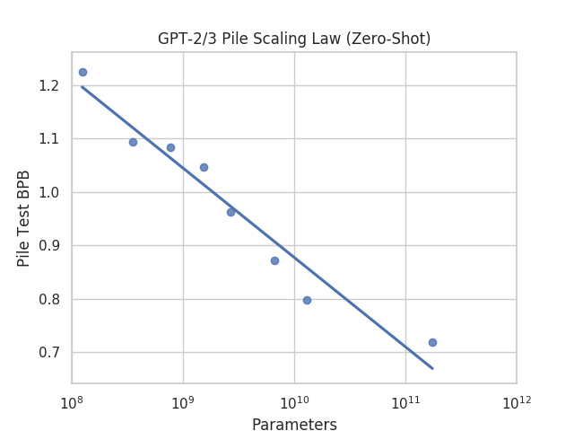 흥미롭게도, GPT-2와 GPT-3이 The Pile에서 훈련되지 않았음에도 불구하고, 여전히 명확한 스케일링 법칙이 존재하며, 수익 감소 현상이 나타나지 않습니다. 이는 이러한 모델들의 내재된 일반화 능력 때문이라고 가정할 수 있습니다. 제로샷 스케일링 법칙에 대한 더 엄격한 분석은 추후 연구로 남겨둡니다.