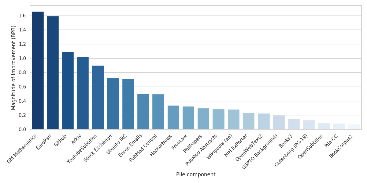 GPT-3이 어떤 구성 요소에서 성능이 저조한지 결정하는 것은 GPT-3이 훈련된 텍스트(웹 페이지와 책)의 분포와 가장 다른 Pile 구성 요소를 식별하는 데 유용합니다. 이러한 구성 요소는 GPT-3 훈련 데이터를 보완하는 데 특히 좋은 후보가 됩니다. 이 결과는 향후 The Pile의 반복에서 어떤 유형의 데이터셋을 강조해야 할지를 결정하는 데도 가치가 있습니다.