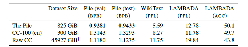 표 3: 크기 조절 평가 결과 각 데이터셋은 모든 평가 메트릭에 대해 중복 제거되고 약 40GB로 하위 샘플링되어 데이터셋 크기의 영향을 제어합니다. LAMBADA의 경우, Radford et al. (2019)에서 소개된 데이터 변형을 사용하며 마지막 단어가 아닌 마지막 토큰에 대한 당혹도만 평가합니다. WikiText의 경우, GPT-2 토큰당 당혹도를 보고합니다. †는 크기가 추정치임을 나타냅니다.