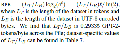 여기서 L_T는 토큰 단위로 된 데이터셋의 길이이고 L_B는 UTF-8로 인코딩된 바이트 단위로 된 데이터셋의 길이입니다. 우리는 The Pile 전체에서 L_T / L_B 값이 0.29335 GPT-2-토큰/바이트임을 발견했습니다; 데이터셋별 L_T / L_B 값은 표 7에서 확인할 수 있습니다.
