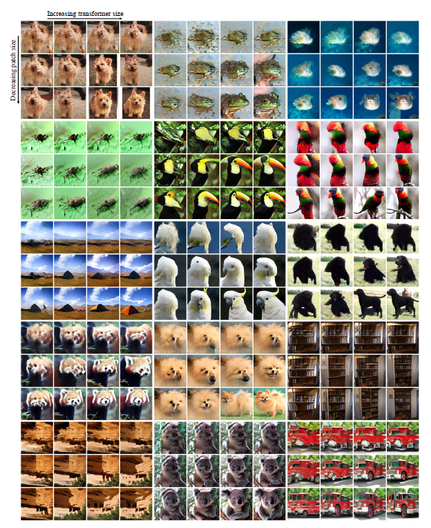 그림 7. 트랜스포머 순방향 패스 Gflops를 증가시키면 샘플 품질이 향상됩니다. 확대해서 보는 것이 좋습니다. 우리는 동일한 입력 잠재 노이즈와 클래스 레이블을 사용하여 400K 훈련 단계 후 모든 12개의 DiT 모델에서 샘플을 생성합니다. 모델의 Gflops를 증가시키면—트랜스포머의 깊이/너비를 증가시키거나 입력 토큰 수를 증가시킴으로써—시각적 충실도가 크게 향상됩니다.